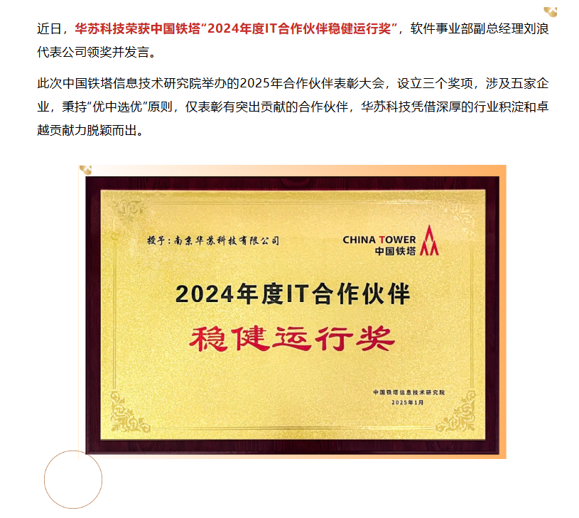 近日,華蘇科技榮獲中國(guó)鐵塔“2024年度IT合作伙伴穩(wěn)健運(yùn)行獎(jiǎng)”,軟件事業(yè)部副總經(jīng)理劉浪代表公司領(lǐng)獎(jiǎng)并發(fā)言。