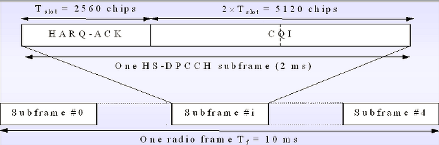 滿足上述條件之后,可以啟動(dòng)HSDPA了,UE接入小區(qū)后,在HS-DPCCH上上報(bào)CQI之后,NodeB也選擇了調(diào)制和編碼方式,但是隨著CQI的不斷變化,NodeB也會(huì)選擇不同的調(diào)制和編碼方式。與此同時(shí),NodeB還要決定用多少資源來(lái)給UE使用。這些信息都是通過(guò)HS-DPCCH來(lái)反饋和傳送。HS-DPCCH數(shù)據(jù)速率為15Kbps,SF=256,采用2ms的短幀,承載HSDPA的兩種上行物理層信令:ACK/NACK和CQI。CQI:信道質(zhì)量指示,ACK/NACK:指示數(shù)據(jù)是否正確,ACK表示沒(méi)錯(cuò),NACK表示出錯(cuò),需要重傳,只有數(shù)據(jù)傳輸時(shí)才發(fā)送。