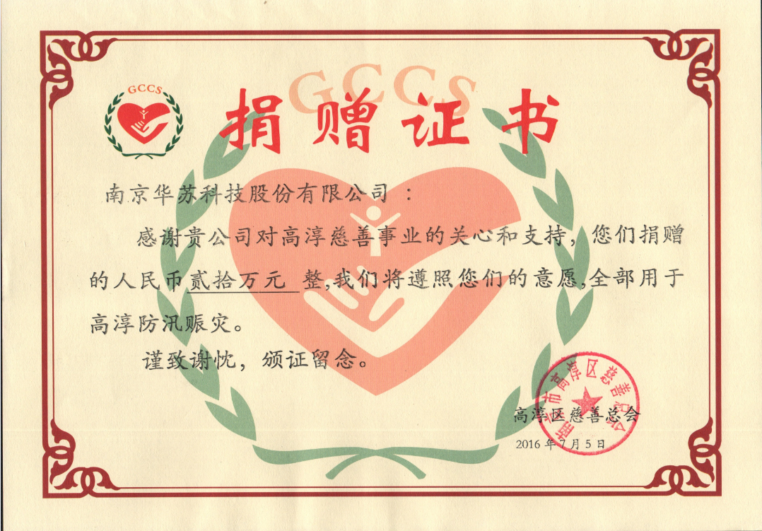 作為愛心企業(yè)之一,南京華蘇科技股份有限公司 一馬當先,向抗洪救災(zāi)一線捐款,以實際行動為防汛抗洪奉獻自己的一份力量。