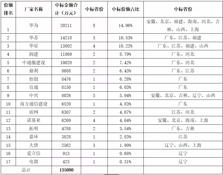 2018年35日,驚蟄一個(gè)足以載入通信網(wǎng)優(yōu)史冊(cè)的日子,這一天印證了羅振宇在時(shí)間的故事里分享的“大者恒大,強(qiáng)者恒強(qiáng)”的預(yù)言,在全國(guó)首輪11個(gè)省份涉及44.63億元的網(wǎng)優(yōu)集中采購(gòu)招標(biāo)盛筵中,華蘇一舉斬獲江蘇第1份額,福建第1和廣東第4份額(簡(jiǎn)稱114),整體份額僅次于華為。