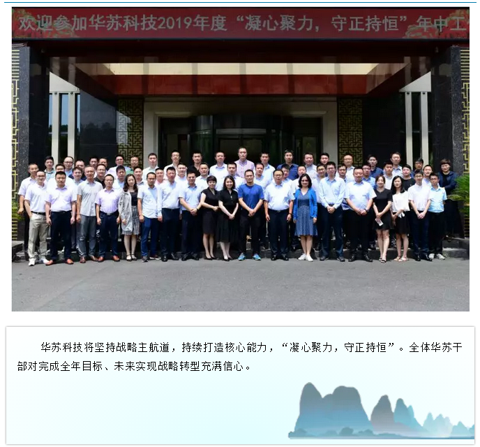 :2019年7月26日至27日,“華蘇科技2019年中工作會(huì)”在南京高淳圓滿召開。 華蘇科技將堅(jiān)持戰(zhàn)略主航道,持續(xù)打造核心能力,“凝心聚力,守正持恒”。全體華蘇干部對(duì)完成全年目標(biāo)、未來實(shí)現(xiàn)戰(zhàn)略轉(zhuǎn)型充滿信心。