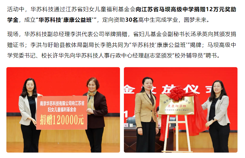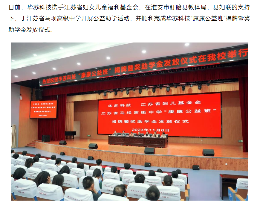 于江蘇省馬壩高級中學開展公益助學活動,并順利完成華蘇科技“康康公益班”揭牌暨獎助學金發(fā)放儀式。