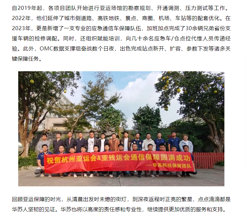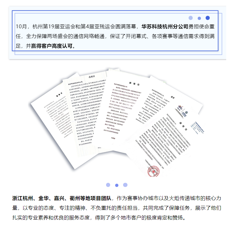10月,杭州第19屆亞運(yùn)會(huì)和第4屆亞殘運(yùn)會(huì)圓滿落幕,華蘇科技 杭州分公司勇?lián)姑厝危?/span>