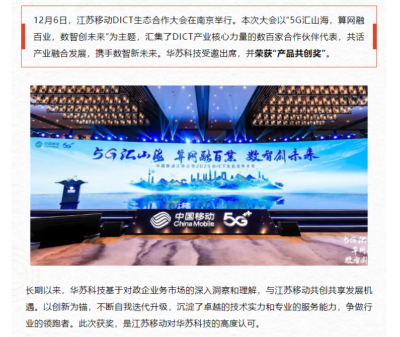 華蘇科技榮獲江蘇移動2023DICT生態(tài)合作“產(chǎn)品共創(chuàng)獎”