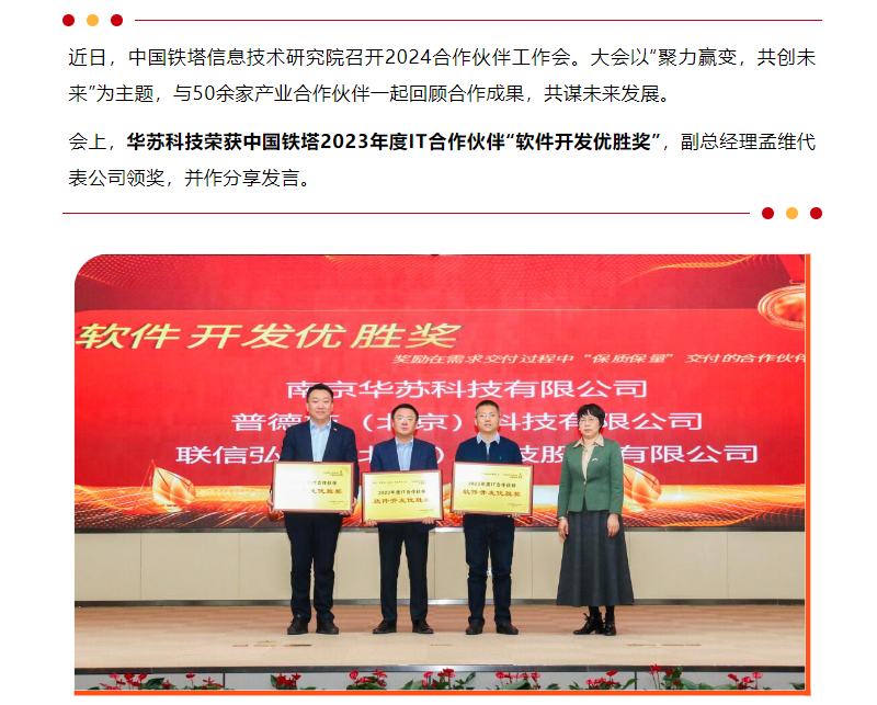 華蘇科技榮獲中國鐵塔2023年度IT合作伙伴“軟件開發(fā)優(yōu)勝獎”