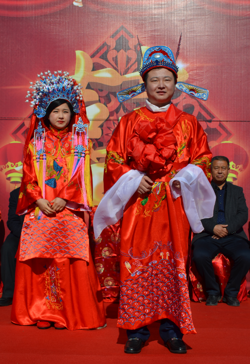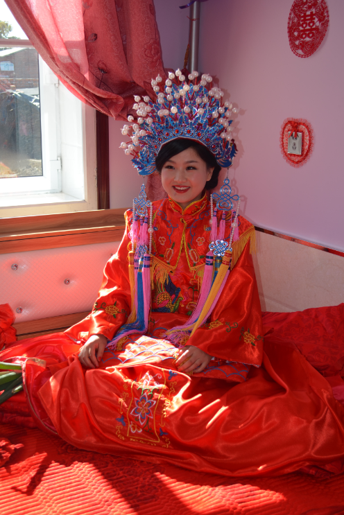 美麗的新娘早已靜候家中,火紅的新衣、精致的頭飾、姣好的面容,端莊而優(yōu)雅。