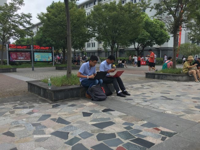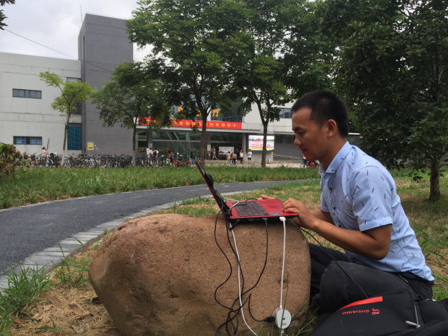 下午五點半左右,外場校園保障工作終于告一段落,他們和“東南大學”留影紀念后便匆匆趕回公司,開會探討保障工作中發(fā)現(xiàn)的問題并研究對策,以及明天的工作安排。趕回的途中,楊軍建說:“今天是陰天,時不時下點小雨,還是比較涼爽的。”樂呵呵的他,如此滿足。